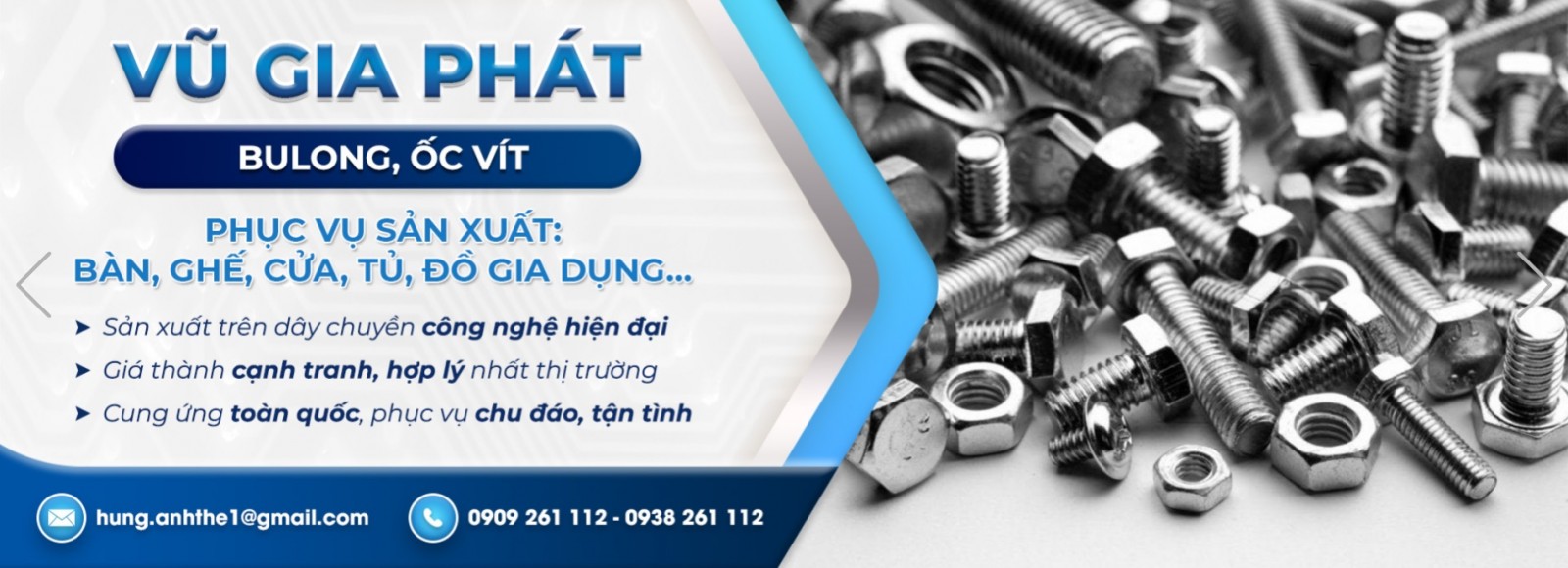 Công ty Vũ Gia Phát là đơn vị cung cấp các loại Bulong, ốc, vít chất liệu 304 phục vụ cho các ngành sản xuất bàn, ghế, cửa, tủ, đồ gia dụng, đồ dùng nhà tắm, đồ gỗ, cơ khí lắp ráp, điện, điện tử, xây dựng,..
