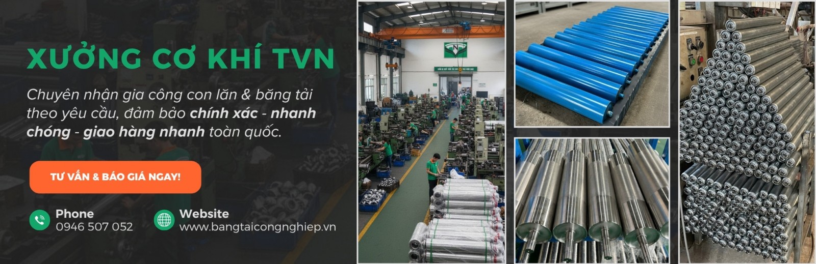 Quý khách có nhu cầu gia công con lăn, băng tải công nghiệp vui lòng liên hệ với TVN qua số Hotline / Zalo: 0946 507 052 hoặc ghé thăm xưởng cơ khí TVN để được tư vấn và hỗ trợ tốt nhất.