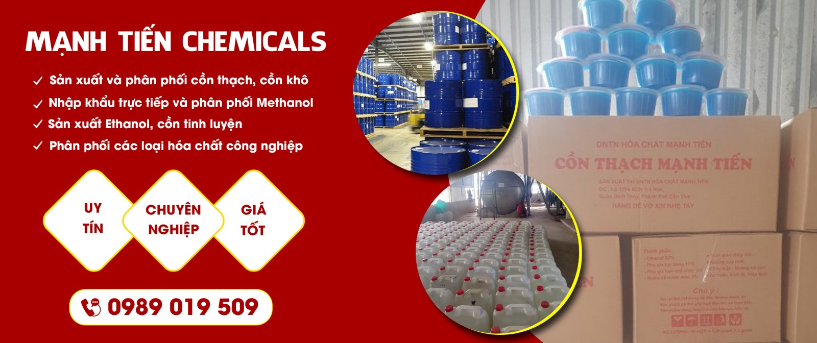 Doanh Nghiệp Tư Nhân Mạnh Tiến là nhà nhập khẩu trực tiếp và phân phối Methanol, ( cồn công nghiệp )..sản xuất Ethanol…( cồn thực phẩm 96 %) … cồn tinh luyện 99,5 % và các loại dung môi công nghiệp ..butyt acetate..tolune..xylen ..phân phối trên toàn quốc.. cam kết giá tốt nhất thị trường