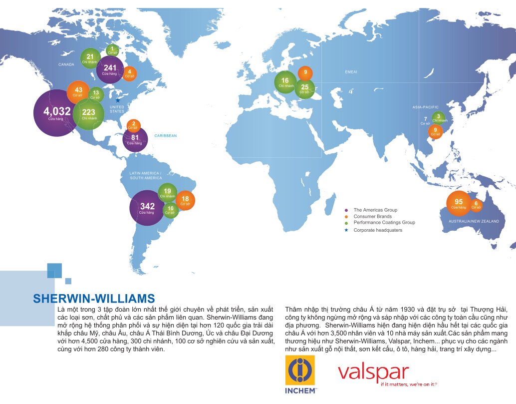 - Nổi bật vượt trội so với các hãng sơn thông thường là thương hiệu này gần như toàn cầu khi khách có vấn đề gì ở đầu bên US/Châu Âu/Á ... thì hầu như SW có cử các cửa hàng hoặc bộ phận kỹ thuật gần đó để chăm sóc, kiểm tra kỹ thuật và tư vấn khách hàng ... Service gần như toàn cầu