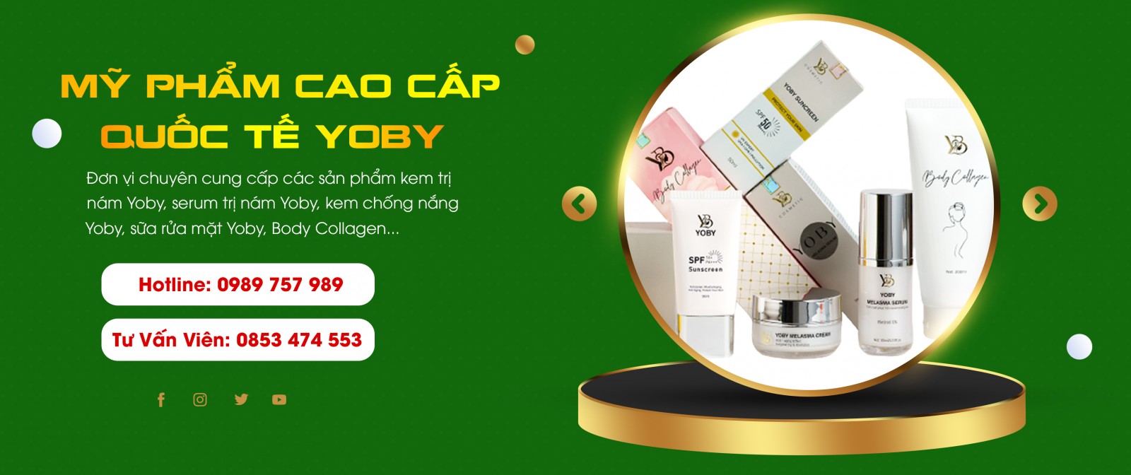 Công Ty TNHH Mỹ Phẩm Cao Cấp Quốc Tế YOBY xin gửi đến toàn thể Quý khách hàng lời chào trân trọng, lời chúc sức khoẻ, hạnh phúc và thành công nhất. Cảm ơn quý khách đã quan tâm ủng hộ và hợp tác đến sản phẩm của công ty chúng tôi trong thời gian dài vừa qua. Đồng hành với sự phát triển của nền kinh tế Việt Nam cũng như trên toàn thế giới hiện nay. Công Ty TNHH Mỹ Phẩm Cao Cấp Quốc Tế YOBY sớm nhận thức được tầm quan trọng của sản phẩm khi đứng vững trên thị trường, nó ảnh hưởng tới vẻ đẹp quý phái của khách hàng.