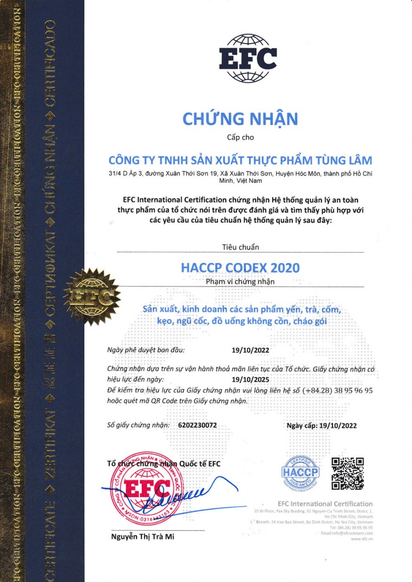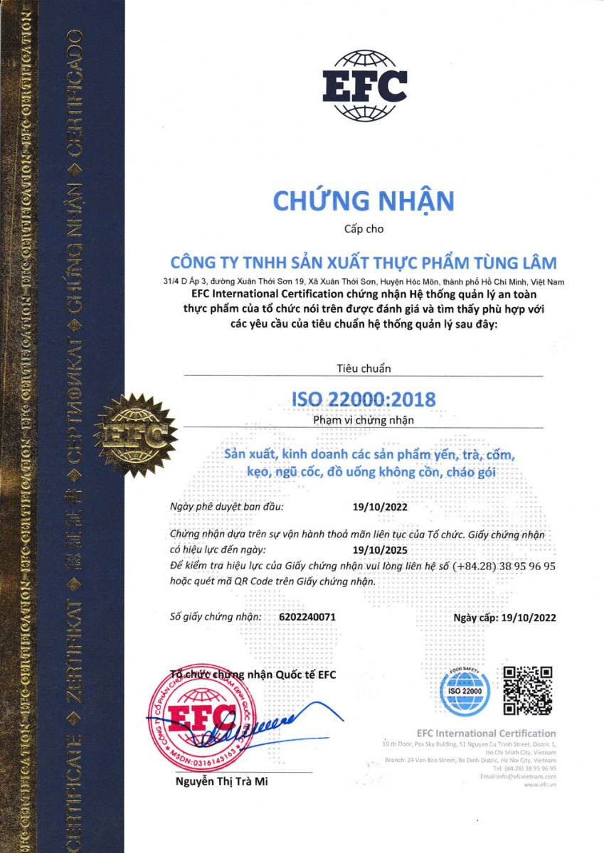 Giấy chứng nhận EFC cho công ty Thực phẩm Tùng Lâm 2018