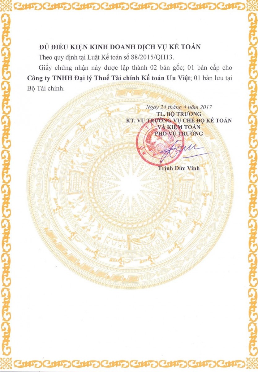 Ưu Việt là một trong số ít các công ty đủ điều kiện cung cấp dịch vụ kế toán, dịch vụ đại lý thuế theo quy định của Bộ Tài chính và Tổng Cục thuế.